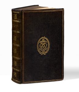 Αι επτα τραγωδιαι. Tragœdiæ septem. Unà cum omnibus Græcis scholiis, & cum Latinis Joach. Camerarii. Annotationes Henrici Stephani in Sophoclem & Euripidem, seorsum excusæ, simul prodeunt. S.l. [Genève], Henri Estienne, 1578. 2 parties en un volume in-4, maroquin olive, triple filet doré, armoiries au centre, dos lisse orné d'un chiffre répété, tranches dorées (Reliure de l'époque). Édition célèbre et importante, le « Sophocle d'Estienne » réunit les Scholies de Triclinius corrigées par Henri Estienne et les commentaires de Joachim Camerarius. En outre, l'original grec des tragédies Ajax et Électre est accompagné de la traduction latine de Camerarius. Élégante impression grecque d'Henri Estienne, ornée de sa marque gravée sur bois au titre. Exemplaire de choix en maroquin olive aux armes et au chiffre de Jacques-Auguste de Thou célibataire (Cat. Bibl. Thuanæ, 1679, p. 268). Magistrat, homme d'État, juriste, historien, humaniste et bibliophile, Jacques-Auguste de Thou (1553-1617) est une des figures les plus marquantes parmi les collectionneurs de livres de son temps. La bibliothèque savante et encyclopédique qu'il avait réunie à la collection de son père, Christophe de Thou, riche d'environ mille manuscrits et huit mille volumes imprimés, demeura sans rivale à Paris jusqu'au milieu du XVIIe siècle. Instrument de travail de l'historien et juriste, sa bibliothèque était également ouverte aux lettrés, humanistes et étudiants de la France et de l'étranger. Très exigeant sur la condition de ses livres, Jacques-Auguste de Thou les faisait relier avec le plus grand soin, d'abord en vélin, puis en maroquin rouge, citron, vert ou violet, de la plus belle qualité, frappé de son chiffre et de ses armes – auxquelles il fit accoler, après son premier mariage en 1587, les armoiries de Marie de Barbançon-Cany, son épouse, puis après son second mariage, en 1602, celles de Gasparde de La Chastre, sa seconde épouse. On peut donc dater la présente reliure d’avant 1587. Étiquette de la librairie Pierre Berès. Dos uniformément passé, insensibles frottements. Coupure marginale au feuillet d4. Renouard, 131, n°3 – Schreiber, n°171 – Adams, S-1448 – GLN : 1565 – Antoine Coron, « Ut prosint aliis. J.-A. de Thou et sa bibliothèque », HBF, II, 100-125.