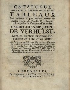 Catalogue d’une riche et précieuse collection de tableaux des meilleurs & plus célèbres maîtres des écoles d’Italie, des Pays-Bas & de France, qui composent le cabinet de feu messire Gabriel-François-Joseph de Verhulst, dont les héritiers proposent l’acquisition en total & en masse. Bruxelles, Antoine d'Ours, 1779. In-4, basane marbrée, dos lisse muet, tranches mouchetées (Reliure de l'époque). Édition originale. Cet importante collection de tableaux flamands, mais aussi italiens et français, est décrite en 280 numéros suivis d'un index des artistes. En frontispice, un portrait du collectionneur gravé par A. Cardon. Coiffes usées, charnière supérieur fragile, quelques épidermures. Lugt, n°3038.