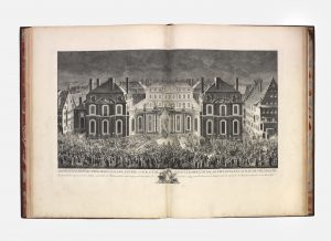 Représentation des fêtes données par la ville de Strasbourg pour la convalescence du Roi ; à l'arrivée et pendant le sérour de Sa Majesté en cette ville. [Paris], Laurent Aubert, [1745]. Grand in-folio, veau marbré, triple filet à froid, armoiries dorées au centre, dos lisse orné de fleur de lis, roulette sur les coupes, tranches rouges (Reliure de l'époque). Superbe livre de fêtes publié par la ville de Strasbourg pour commémorer les fêtes qu'elle offrit à Louis XV du 5 ou 10 octobre 1744. Entièrement gravé, l'ouvrage comprend un titre-frontispice et onze planches à double page, par Charles Parrocel, Jean Chavallier et Jean-Martin Weiss, interprétées sur cuivre par Johan Georg Wille, Le Parmentier, Martin Marvie et Jacques-Philippe Le Bas. Ces planches, magnifiques, représentent l'arrivée du roi, le cortège, l'entrée à la cathédrale, le palais épiscopal, les décorations et illuminations de divers monuments, le feu d'artifice, les jeux et danses. Le texte de la relation est orné d'une grande vignette en-tête et d'un cul-de-lampe gravés par Marvie d'après l'auteur. En outre, chaque page est contenue dans un encadrement décoratif. Exemplaire relié aux armes royales. Manque le portrait équestre de Louis XV. Charnières fendues, manques et épidermures au dos, galerie de ver marginale limitée aux seuls feuillets de texte. Berlin Kat., n°3015 – Cohen, 870 – Watanabe, n°2092.