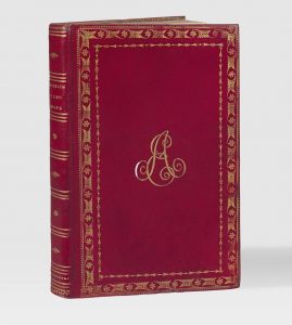Calendrier pour l'année mdcccvii, dédié et présenté à Sa Majesté l'impératrice et reine Joséphine. Paris, Chaise jeune, [1807]. In-8, maroquin rouge, trois roulettes dorées en encadrement, chiffre doré au centre, dos lisse orné, coupes décorées, dentelle intérieure dorée, tranches dorées (Reliure de l'époque). Luxueux almanach mythologique dédié à Joséphine de Beauharnais. L'ouvrage est orné d'un frontispice allégorique et de dix planches hors texte contenant les portraits en médaillon d'Apollon et des Muses, le tout dessiné par Louis Lafitte et gravé au pointillé par Parfait Augrand. Un des rares exemplaires avec les dix médaillons en couleurs. Magnifique exemplaire dans une fraîche reliure au chiffre entrelacé du prince Eugène de Beauharnais, vice-roi d'Italie, et de son épouse Augusta-Amalia de Bavière. Il est cité dans le Manuel des reliures armoriées d'Olivier, Hermal et de Rotton. De la collection napoléonienne Émile Brouwet (1934, n°68). Quelques infimes rousseurs. Grand-Carteret, n°1508 – OHR, 2671, fer n°3 (exemplaire cité).