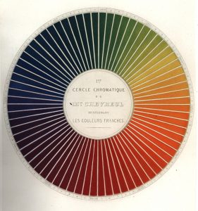 Exposé d'un moyen de définir et de nommer les couleurs, d'après une méthode précise et expérimentale, avec l'application de ce moyen à la définition et à la dénomination des couleurs d'un grand nombre de corps naturels et de produits artificiels. Paris, Firmin Didot, 1861. 2 volumes, dont un vol. de texte in-4 et un atlas in-folio, demi-maroquin noir à long grain, dos lisse orné de filets dorés, couvertures et dos (Reliure pastiche). Édition originale, publiée dans le trente-troisième tome des Mémoires de l'Académie des sciences. Le fort volume de texte comprend l'ouvrage de Chevreul (pp. 1-944), précédé seulement d'un Éloge historique de François Magendie par Pierre Flourens (pp. i-lxxiii). L'atlas renferme quatorze planches en couleurs, dont une dépliante, « chromographiées » par Digeon, ainsi qu'une planche à système lithographiée en noir. La théorie de Chevreul divise les couleurs en deux groupes, couleurs primaires (bleu, jaune, rouge) et secondaires (obtenues par le mélange de deux couleurs primaires). Le principe de la juxtaposition des couleurs pures, laissant à l'œil le soin de reconstituer les couleurs intermédiaires, eut une influence considérable sur la peinture des impressionnistes et plus encore des pointillistes, Seurat et Signac en tête. Ce dernier reconnaîtra sa dette envers Chevreul dans son ouvrage D'Eugène Delacroix au néo-impressionnisme (1899). Bel exemplaire, lavé et encollé, dans une remarquable reliure à l'imitation.