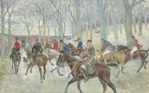 Chasse à courre en forêt. Aquarelle signée (27,5 x 43,5), cadre en bois doré (éclats).