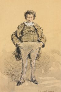 Dessin original signé et légendé J'ai enfoncé Jalouret ! Encre noire, lavis d'aquarelle et rehauts de blanc (32 x 21,5 cm), cadre en bois argenté moderne, sous-verre et marie-louise. Très beau dessin de Gavarni, pseudonyme du dessinateur et lithographe Sulpice-Guillaume Chevalier (1804-1866). Il représente un personnage en pied, les mains dans les poches et l'air satisfait.