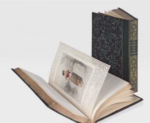 Les Joyaux. – Les Parures. Paris, G. de Gonet, Martinon, Veuve Janet ; Leipzig, Charles Twietmeyer, s.d. [1850]. 2 volumes grand in-8, demi-maroquin vert à long grain avec coins, filets dorés, dos lisse orné en long, tête dorée, non rogné, couvertures (Canape). Édition originale de ce bel ouvrage en deux parties, illustré d'un titre-frontispice répété dans chaque volume et de trente-et-une planches dessinées par Gavarni et gravées par Geoffroy, en premier tirage. Le texte de cette jolie « fantaisie » est de Joseph Méry ; il est suivi dans Les Joyaux d'une Minéralogie des dames et dans Les Parures d'une Histoire de la mode, composées par le Comte de Fœlix, pseudonyme de Louis-François Raban. Très bel exemplaire avec les gravures coloriées à marges de dentelles, condition dans laquelle il est assez rare de rencontrer les deux volumes réunis, d'après Carteret. Ex-libris au chiffre CM. Carteret, III, 460-461 – Vicaire, V, 770-771.