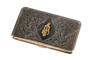 PRAJADHIPOK (RAMA VII), roi de Thaïlande (1893-1941). Etui à cigarettes en argent niellé, de forme rectangulaire, le couvercle à charnières est orné au centre du monogramme en or du roi sous couronne. Travail thaïlandais du XXe siècle. L. :...