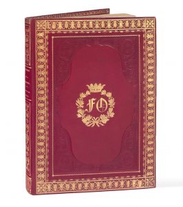 Budget général des dépenses du ministère de la Marine et des Colonies pour l'exercice 1836. Paris, Imprimerie royale, janvier 1835. In-4, maroquin rouge, large bordure dorée bordée de deux fines roulettes, larges plaques à froid aux écoinçons, chiffre couronné au centre, dos lisse orné en long, coupes décorées, dentelle intérieure dorée, doublures et gardes de moire bleu ciel, tranches dorées (Reliure de l'époque). Édition originale. « Ces budgets ont été publiés tous les ans, ainsi que les pièces justificatives comportant les états des bâtiments à flot (vaisseaux, frégates, corvettes, bricks, goélettes et avisos, cutters, lougres et félouques, canonnières et autres bâtiments de flotille, flûtes, gabares, transports) » (Polak). Bel exemplaire relié en maroquin décoré au chiffre du duc Ferdinand-Philippe d'Orléans (1810-1842), fils aîné de Louis-Philippe et de Marie-Amélie. D'abord duc de Chartres, il prit à l'avènement de son père sur le trône, les titres de duc d'Orléans et de prince royal de France. Il participa à la prise d'Anvers et à la conquête de l'Algérie. Habiles restaurations à la reliure, des rousseurs. Polak, n°1307 – Guigard, I, 40 – OHR, 2580 (fer non signalé).