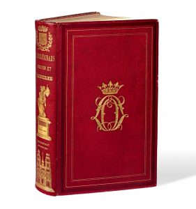 L'Orléanais. Histoire des ducs et du duché d'Orléans, comprenant l'histoire et la description de la Beauce, du pays chartrain, du Blésois, du Vendomois, du Gâtinais, du Perche, et de ce qui constituait l'ancienne généralité d'Orléans. Paris, Mallet & Cie, 1845. Grand in-8, chagrin rouge, filets dorés et à froid en encadrement, chiffre doré et plaque allégorique signée Haarhaus au centre des plats, dos lisse orné de fers dorés, dentelle intérieure dorée, tranches dorées (Reliure de l'éditeur). Édition originale, illustrée de quatorze planches hors texte et de nombreuses vignettes dans le texte gravées d'après Baron, Français, Nanteuil et Rouargue, en premier tirage, et de deux cartes hors texte en couleurs. Bel exemplaire en reliure décorée d’éditeur au chiffre de Louis d'Orléans (1814-1896), duc de Nemours, second fils de Louis-Philippe, avec un cachet au même chiffre sur le faux-titre. Il s'agit probablement d'un exemplaire de présent, relié spécialement pour la famille d'Orléans. Quelques rousseurs. Cahier 22 relié après le cahier 24. Carteret, III, 474 – OHR, 2585, fer 13.