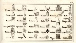 Le Mot et la chose, ou Élémens figurés de la lecture, à l'usage des enfans et de toute personne qui veut apprendre à lire, seule et en s'amusant. Paris, et dans les départemens, chez tous les libraires et marchands de nouveautés, 1833. In-8 oblong, demi-chagrin prune, dos lisse orné, couverture (Reliure du XIXe siècle). Très rare livret pédagogique, illustré de 800 petites figures imprimées sur 32 planches accompagnées de 10 pp. de texte explicatif réservé au maître. Exemplaire remarquablement conservé et bien complet de la couverture imprimée sur papier rose. Petit trou sur un mors.