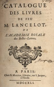 Catalogue des livres de feu M. Lancelot, de l'Académie royale des Belles-Lettres. Paris, Gabriel Martin, 1741. In-8, veau granité, dos orné, tranches mouchetées (Reliure de l'époque). Édition originale rare du catalogue de la bibliothèque d'Antoine Lancelot. Établi par les soins du libraire Gabriel Martin, il décrit 6000 numéros. Exemplaire bien complet du supplément de 76* pp., avec les prix d’adjudication manuscrits dans les marges. Il porte sur le titre l'ex-libris manuscrit de Mésange et cette note au verso : Les chiffres marqués en marge sont les prix auquel chacun des articles ont été adjugés a la vente des livres de M. Lancelot en 1741, temps ou le pain etoit cher et ou la misere avoit resserré les bourses, ainsi les livres ont été donné bien au dessous de leur prix (sic). Coins, coiffes et mors usés, petit accroc dans un caisson. Peignot, 107 – Pollard & Ehrman, n°278 – North, n°59.