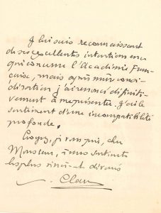 Je lui suis reconnaissant de ses excellentes intentions en ce qui concerne l'Académie Française, mais après mûre considération j'ai renoncé définitivement à me présenter.