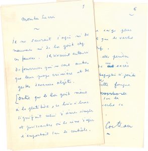 Jean COCTEAU. Manuscrit autographe signe, Monstres Sacrés, [octobre 1953] ; 6 pages in-8, quelques ratures et corrections.