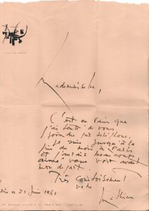 Georges MATHIEU (1921-2012). L.A.S., Paris 21 juin 1961, à Edmonde Charles-Roux ; 1 page grand in-fol. à l'encre de Chine sur papier chiffon à son filigrane, sa vignette gravée et sa devise - Moult de parte - , adresse au verso avec 2 cachets...