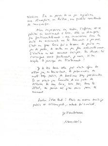 La Crève. Edmonde lui a demandé de lire le manuscrit de son roman en cours Elle, Adrienne [Grasset 1971] sur lequel il lui donne ses premières impressions : il en aime le romanesque, le sujet, le thème, mais se montre assez sévère envers la forme, qui«doit être améliorée, accélérée, parfois simplifiée. Tu le sais, je suis très sensible à ces questions de forme, de style. Elles me bloquent parfois dans mes réactions. [...]