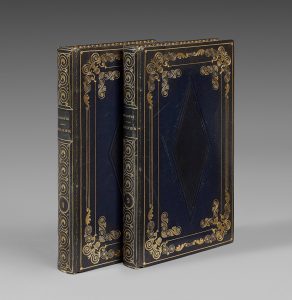 Maroquin bleu nuit à grain long, décor doré, filets d'encadrement, arabesques dans les angles, losanges à froid sur les plats, dos longs très ornés, tranches dorées, non rogné.