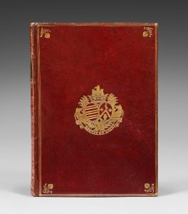 Maroquin rouge, décor doré, armes au centre des plats, triple filet d'encadrement, dos long orné, gardes de papier dominote, tranches dorées