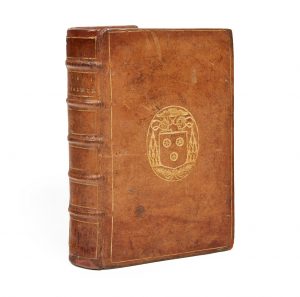 Basane fauve, filet doré en encadrement et armes dorées au centre sur les plats, dos à nerfs orné de filets dorés, tranches dorées (reliure de l'époque).