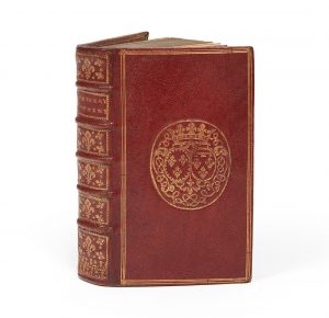 Maroquin rouge, triple filet doré en encadrement et armes dorées au centre sur les plats, dos à nerfs orné, roulette dorée intérieure, tranches dorées sur marbrures (reliure de l'époque).