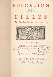 FÉNELON (François de Salignac de La Mothe). Éducation des filles. Paris : Pierre Auboin, Pierre Emery, Charles Clousier, 1687. — In-12, 153 x 90 : (1 f.), 269 pp. mal chiffrées 275, (6 ff.).