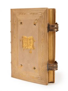 Maroquin beige, encadrement de filets et de fleurs dorés, fleurs dorées et mosaïquées de maroquin jaune et noir aux angles à l'intérieur du cadre et super libris doré au centre sur les plats ;