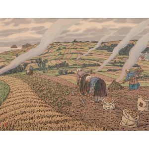 HENRI RIVIÈRE (1864-1961)LE TRAVAIL AUX CHAMPS, planche 2 de la série "Au Vent de Noroît". 1906. Lithographie en couleurs sur vélin. Épreuve timbrée, légèrement jaunie. Quelques traces de plis de manipulation, petit enfoncement dans le...