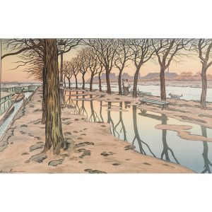 HENRI RIVIÈRE (1864-1961)L'ÎLE DES CYGNES, planche de la série des Paysages Parisiens, 1900Lithographie en couleurs sur vélin, timbrée, légèrement jaunie. Cassure dans l'angle supérieur droit, déchirures restaurées dans les marges...