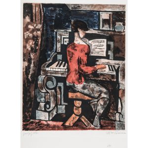 JACQUES VILLON (1875-1963)LA FEMME AU PIANO d'après F. Gromaire, 1929Aquatinte en couleurs sur vélin d'Arches. Épreuve signée par Gromaire, numérotée 178/200. Légèrement jaunie avec quelques taches. Bonnes marges.Feuillet : 660 x...
