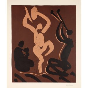 PABLO PICASSO (1881-1973)MÈRE, DANSEUR ET MUSICIEN, 1959Gravure sur linoléum. Épreuve sur vélin d' Arches numérotée 35/50 et signée.Légères éraflures, infimes enlèvements.Feuillet : 745 x 617 mm ; Sujet : 635 x...