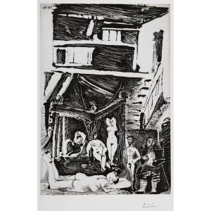 PABLO PICASSO (1881-1973)VIEIL HOMME SONGEANT À SA VIE, 28-05-1968Planche de la série 347.Aquatinte. Épreuve numérotée 3/50 et signée. Bords légèrement jaunis.Feuillet : 655 x 465 mm ; Sujet : 492 x 333 mmBloch...