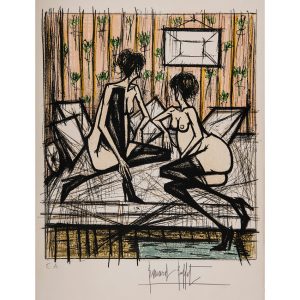 BERNARD BUFFET (1928-1999)JEUX DE DAMES, Une plancheLithographie en couleurs sur vélin. Épreuve annotée EA et signée. Tirage total à 250 exemplaires.Report du sujet au verso. Bonnes marges.Feuillet : 750 x 550 mm ; Sujet :...