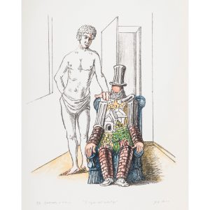 GIORGIO DE CHIRICO (1888-1978)IL REPOSE DELL' ARCHEOLOGO, 1970Lithographie sur vélin avec rehauts de couleurs. Épreuve annotée "P.A." en dehors de l'édition à 124 exemplaires, titrée et signée. Cachet sec de l'éditeur Alberto Caprini...