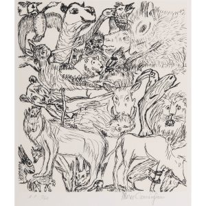 MERCE CUNNINGHAM (NÉ EN 1919)UNIVERS ANIMALIER, 1984Pointe sèche. Épreuve numérotée AP 7/49 et signée. Cadre.Feuillet à vue : 560 x 385 mm ; Sujet : 236 x 210 mm