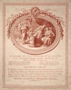 MARIAGE de MARIE-ANTOINETTE d’AUTRICHE avec le DAUPHIN LOUIS XVI Futur Roi de France le 16 mai 1770. Gravure : « Allégorie sur l’Alliance de Mgr Le Dauphin avec l’Archiduchesse Marie Antoinette, célébrée à Versailles le 16 May 1770....