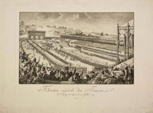 RÉVOLUTION. 2 GRAVURES : «Fédération générale des Français au Champ de Mars le 14 Juillet 1790 » La Fête de la Fédération, 1er Anniversaire du 14 Juillet 1789.  Impr. C. Chardon, Paris (44 x 59) &  (10 Août 1792) « Pompe funèbre...
