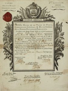 fidèles services rendus à l’État. Pièce signée DE BELAIR Commandant de la Garde Nationale de PARIS, du Comte Pierre-Auguste HULIN Capitaine de la Compagnie (Paris 1758-1841 – Futur Général, héros de la prise de la Bastille) , Griffe de Jérôme PÉTION DE VILLENEUVE Maire de PARIS. Fait à PARIS le 31 Décembre 1791. Cachet de cire. 1page gravée aux armes de Paris (31 x 23)