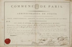 Officiers municipaux administrateurs de POLICE - Fait au Département de Police le 1er Pluviôse an 2 (20 Janvier 1794) - Vignette “Commune de Paris.” et Cachet de cire - Diplôme (28 x 43) impr. rempli à l’encre