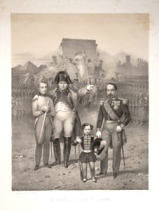 LES NAPOLÉONS. Estampe « Le Passé, le Présent et l’Avenir » par R. de Moraine. Impr. Lemercier. 1864. Lithographie représentant Napoléon1er et l’Aiglon (Napoléon II), Napoléon III et le Prince Impérial (Napoléon IV). (53 x 42) Etat B