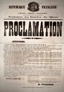 Lorraine avec la Ville de METZ, l’Alsace moins l’héroïque forteresse de BELFORT, une indemnité de guerre de cinq milliards et l’occupation d’une partie du territoire jusqu’au paiement de cette indemnité ! Moyennant ces douloureux sacrifices. Paris sera délivré de l’occupation allemande et nos prisonniers seront remis en liberté…. C’est le maintien de la République qui nous vengera des exigences de l’empire Allemand. Soyons un peuple libre… Je m’adresse à vous, habitants de la Cité Marseillaise … Sauvons l’ordre, c’est par lui que vit la République. Nous garderons ainsi pour l’avenir une citadelle qui ne capitule jamais : le bon droit, et une arme qui ne se brise pas : la Liberté. » Typographie J. Doucet et Comp. Imprimeurs de la Préfecture, 7 rue Moustiers.