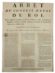 du 10 Juillet 1785. » - du 14 Janvier 1789 – «Art. 1) Veut & ordonne sa Majesté, que les Négociants & Fabricants de son royaume, ensemble les Administrateurs de la Compagnie des Indes, remettent à son Conseil, le plus promptement possible, les plans, mémoires & projets qu’ils jugeront les plus propres à concilier les intérêts des Fabriques nationales & du commerce particulier avec celui de la compagnie des Indes… (pour remédier à l’introduction frauduleuse des Marchandises provenant des fabriques & du commerce étranger…) - Publié par le Comte d’AGAY Intendant en Picardie – Impr. à AMIENS (80), chez J.B. CARON L’Ainé, imprimeur du roi, Pace du Périgord. 1789 -