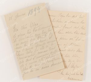 MARIE, princesse de Danemark, née princesse d'Orléans (1865-1909). L.A.S. « Valdemar », écrite par Marie puis par Valdemar, adressée à sa belle-sœur, la reine Olga de Grèce, née grande-duchesse de Russie (1851-1920), 15 janvier 1894, 5 p.,...