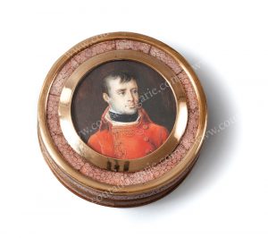 peint d'après le tableau de Jean-Pierre Franque (1774-1860), dans un entourage en cuivre. Bon état général Travail français du XVIIIe siècle. Miniature : Diam. : 5 cm. Tabatière : Diam. : 8, 5 cm - H. : 3, 5 cm. Provenance : cadeau d'usage offert par Napoléon Bonaparte (1769-1821).
