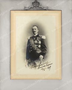 VICTOR-EMMANUEL III, roi d'Italie (1869-1946). Portrait photographique signé Guigoni & Bossi à Miland le représentant posant en uniforme de l'armée, avec dédicace autographe signée au bas du document : « Vittore Emanuele comando supremo,...