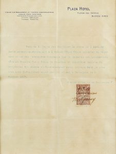 1 page in-4 à en-tête du Plaza Hotel Buenos Aires avec timbre fiscal (encadré avec photo).