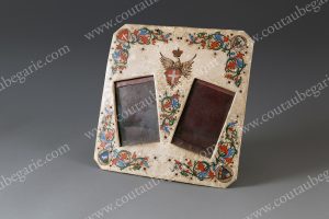 FAMILLE ROYALE ITALIENNE. Cadre pour photographiques en parchemin, de forme carré pouvant accueillir deux photographies, orné d'un décor polychrome, avec au centre le blason de la famille royale italienne. Travail italien du début du XXe siècle....