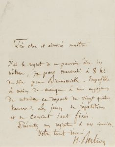 J’ai le regret de ne pouvoir être des vôtres, je pars mercredi à 8 h. du soir pour Brunswick. Impossible à moins de manquer à mes engagemens de retarder ce départ de vingt quatre heures. Les jours de répétitions et de concert sont fixés »…