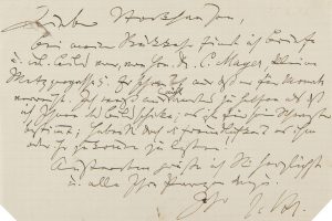 Il a trouvé, à son retour, des lettres et un portrait de la part du Dr C. Mayer, kleine Metzgergasse 5, qui écrit qu’il sera en voyage pour des mois. Brahms ne sait que faire sinon envoyer à Stockhausen ce portrait, destiné à la sœur de Mayer, en le priant de le faire parvenir à l’un ou à l’autre ! Il lui adresse son salut du fond du cœur, et à tous ses chenapans…