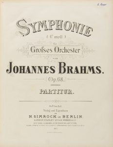 • Symphonie (C moll) für Grosses Orchester... Op.68. Partitur (Berlin, N. Simrock, 1877), cotage 7957 [Hofmann p. 147 ; Fuld p. 551].