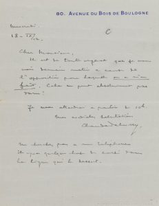 Sur ses soucis d’argent (les fautes témoignent de l’inquiétude de Debussy).