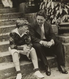 Enesco, en costume sombre, et le jeune Menuhin en culotte courte, sont assis sur les marches extérieures d’une maison.