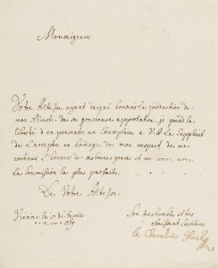 « Votre Altesse ayant daigné honorer la production de mon Alceste de sa gracieuse approbation, je prend la liberté d’en présenter un exemplaire à V. A. la suppliant de l’accepter en hommage de mon respect, de me continuer l’honneur de ses bonnes grâces »…