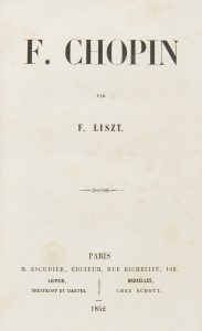 LISZT Franz (1811-1886). F. Chopin (Paris, M. Escudier ; Leipzig, Breitkoff [sic] & Härtel ; Bruxelles, Schott ; 1852) ; in-8, (4)-206-(2 dont la dernière blanche) p. ; reliure demi-percaline chagrinée noire, dos lisse fileté (reliure...